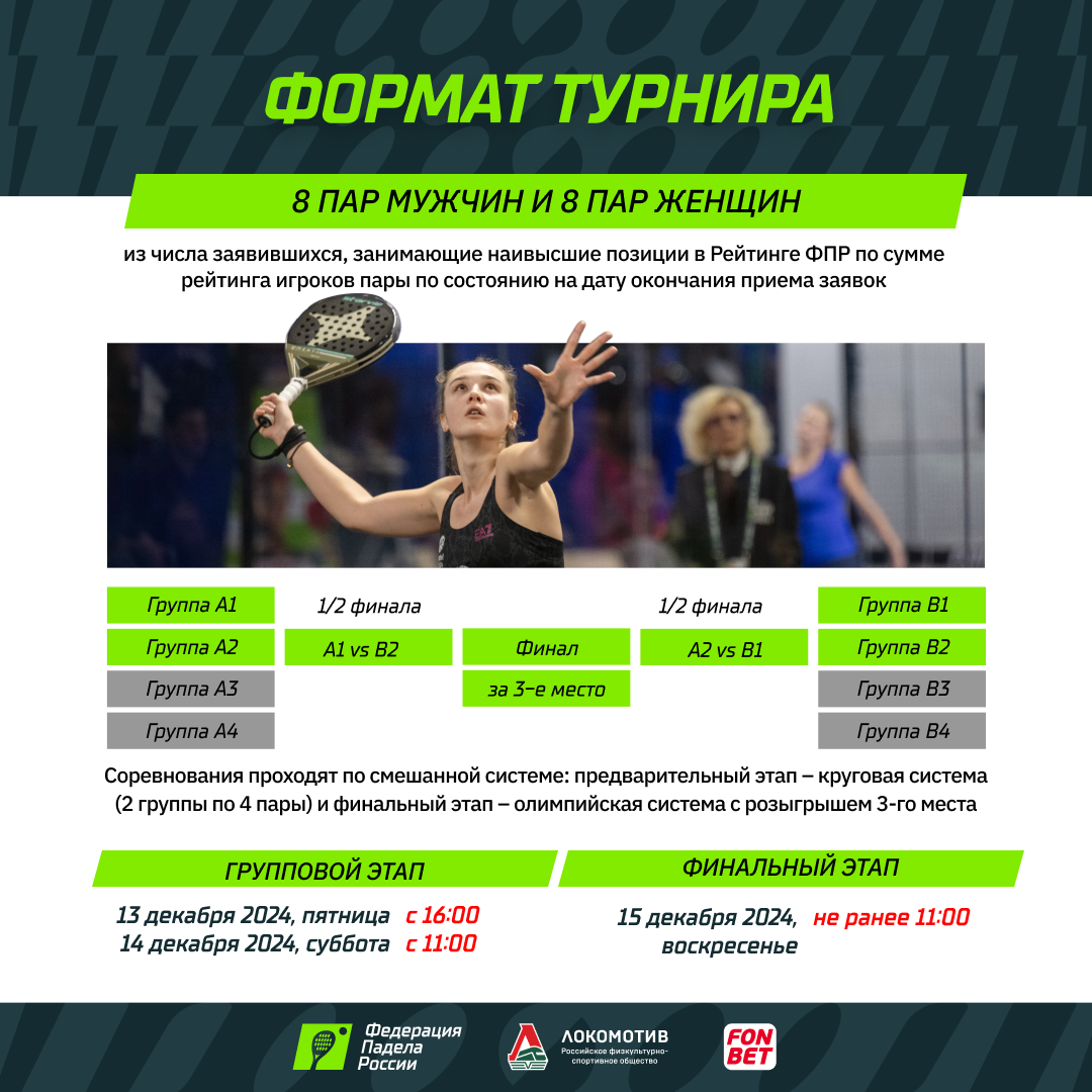 К участию в турнире допускаются 8 пар мужчин и 8 пар женщин из числа заявившихся, занимающие наивысшие позиции в Рейтинге ФПР по сумме рейтинга игроков пары по состоянию на дату окончания приема заявок. После окончания приема заявок из числа не прошедших по рейтингу пар будет сформирован резервный список участников на случай отказа от участия одной или нескольких пар, допущенных к турниру. В случае отказа от участия в турнире одной из пар право участия в турнире в первую очередь предоставляется паре из резервного списка с наивысшим рейтингом.